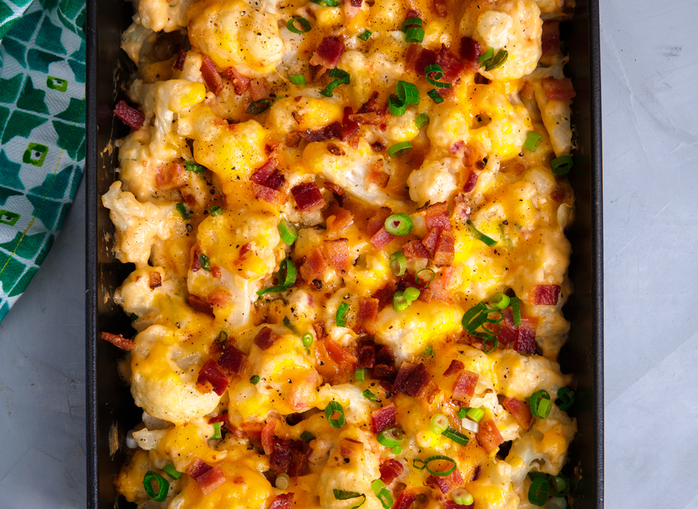 - In a 9”-x-13” dish, add drained cauliflower. Pour over cheese sauce and stir until combined. Stir in all but 1 tablespoon each cooked bacon and green onions until combined, then top with remaining cheddar, bacon, and green onions.