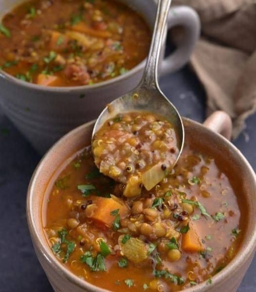 Bring the soup to a boil, then lower the heat and let it simmer for about 30 minutes, or until the lentils and quinoa are tender.