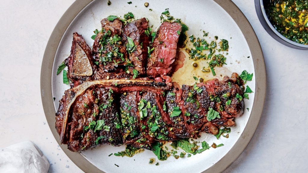 Season steak generously with salt. Grill over direct heat, keeping tenderloin (the smaller side) away from the most intense heat and turning steak about every minute or so to control flare-ups and ensure even browning, until deeply browned on all sides (including standing it on its side with tongs to render and brown fat around edges), 6–8 minutes.